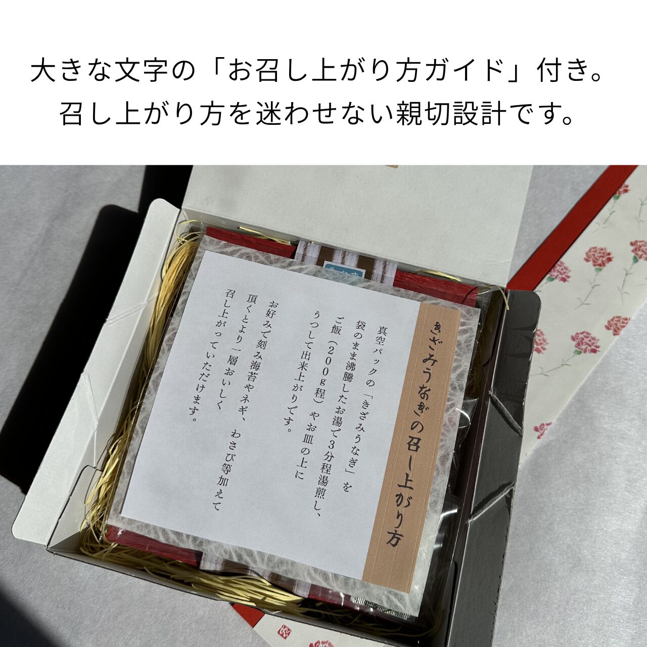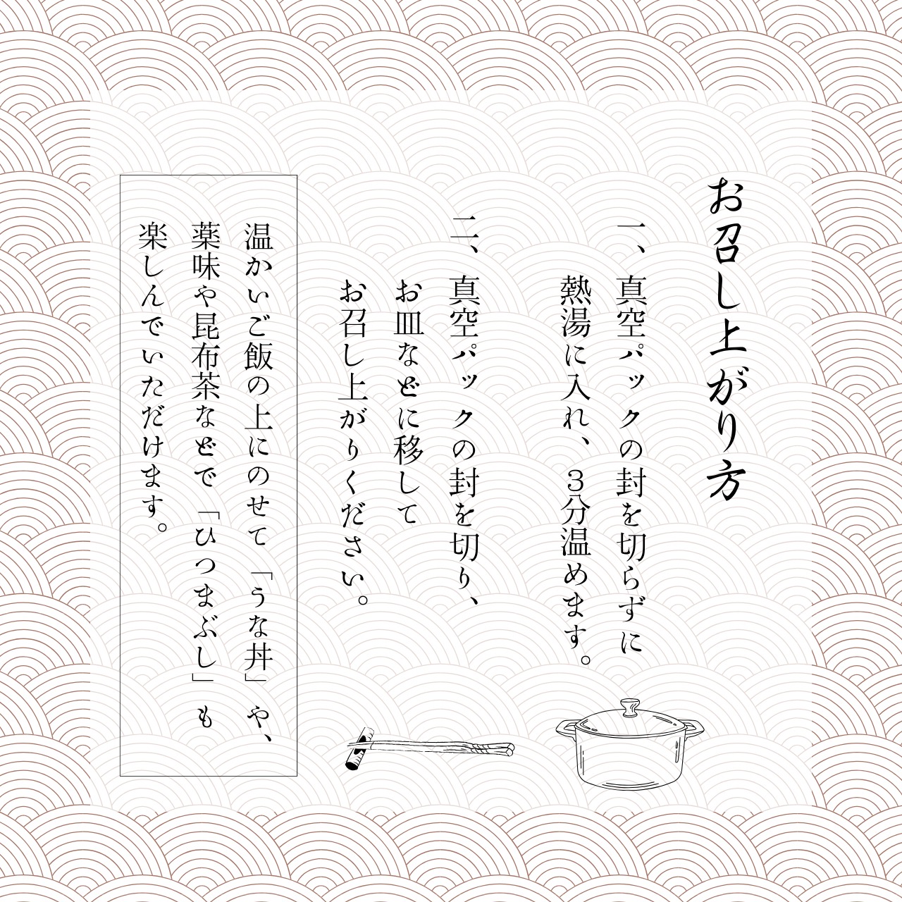 召し上がる際には、「きざみうなぎ」は真空パックのまま沸騰したお湯に3分程湯せんして頂き召し上がってください。