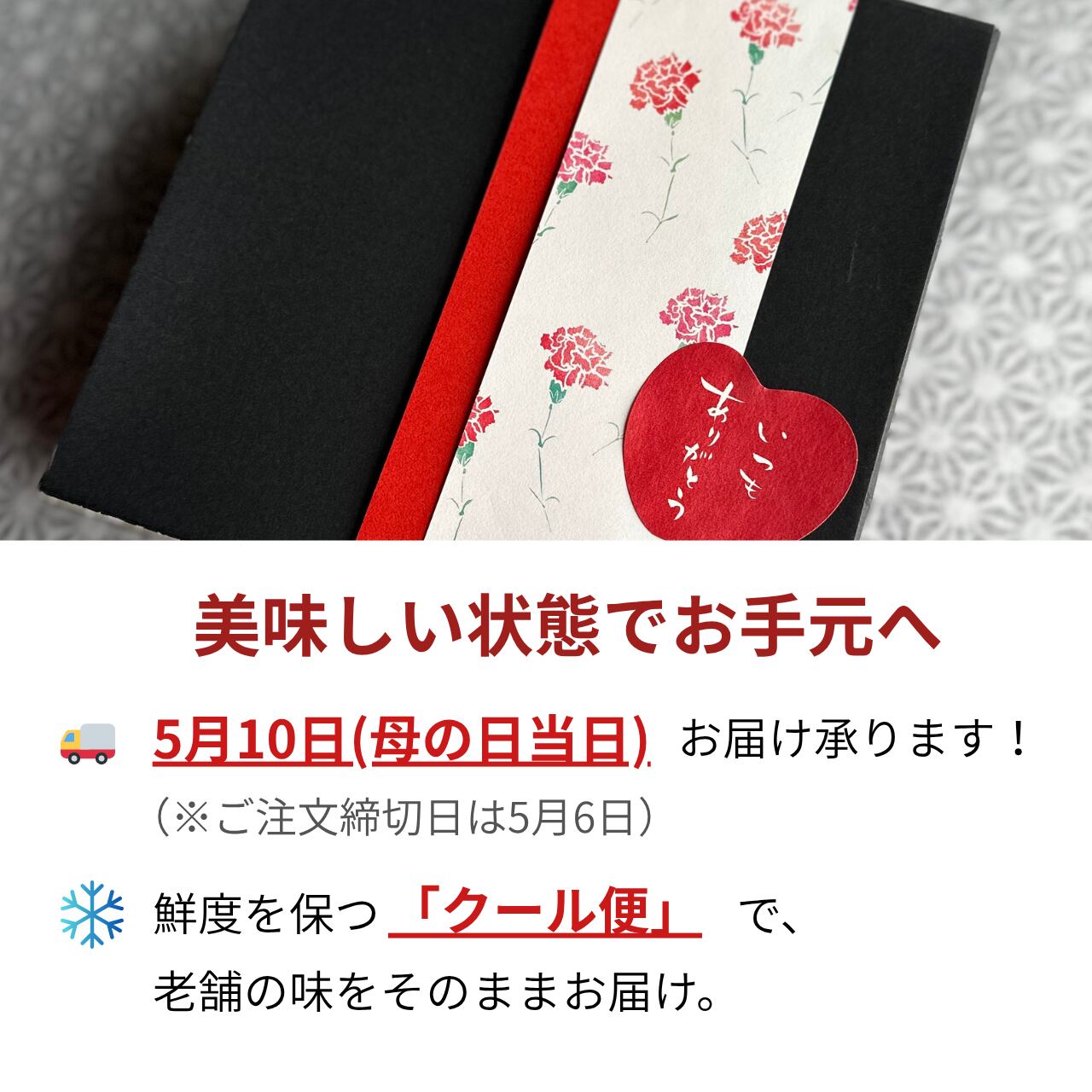 ・5月10日(母の日当日)お届けの場合、備考欄にご希望お日にち、時間指定などがありましたらその旨をご入力ください。